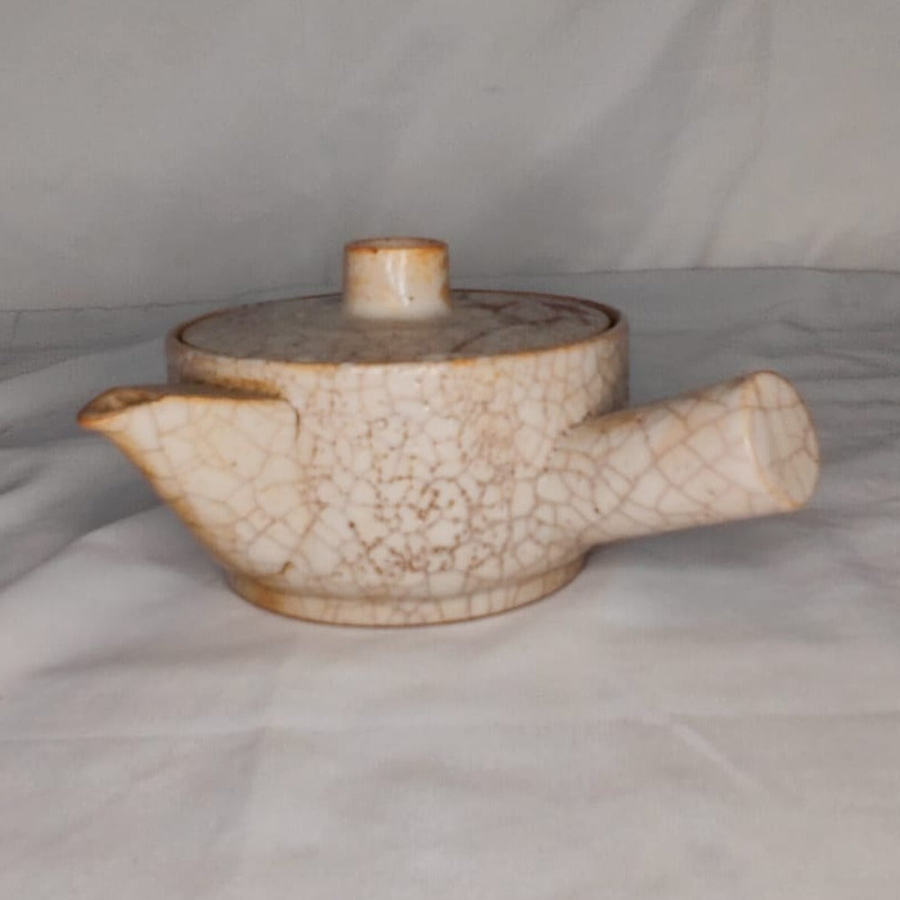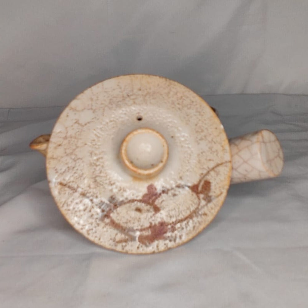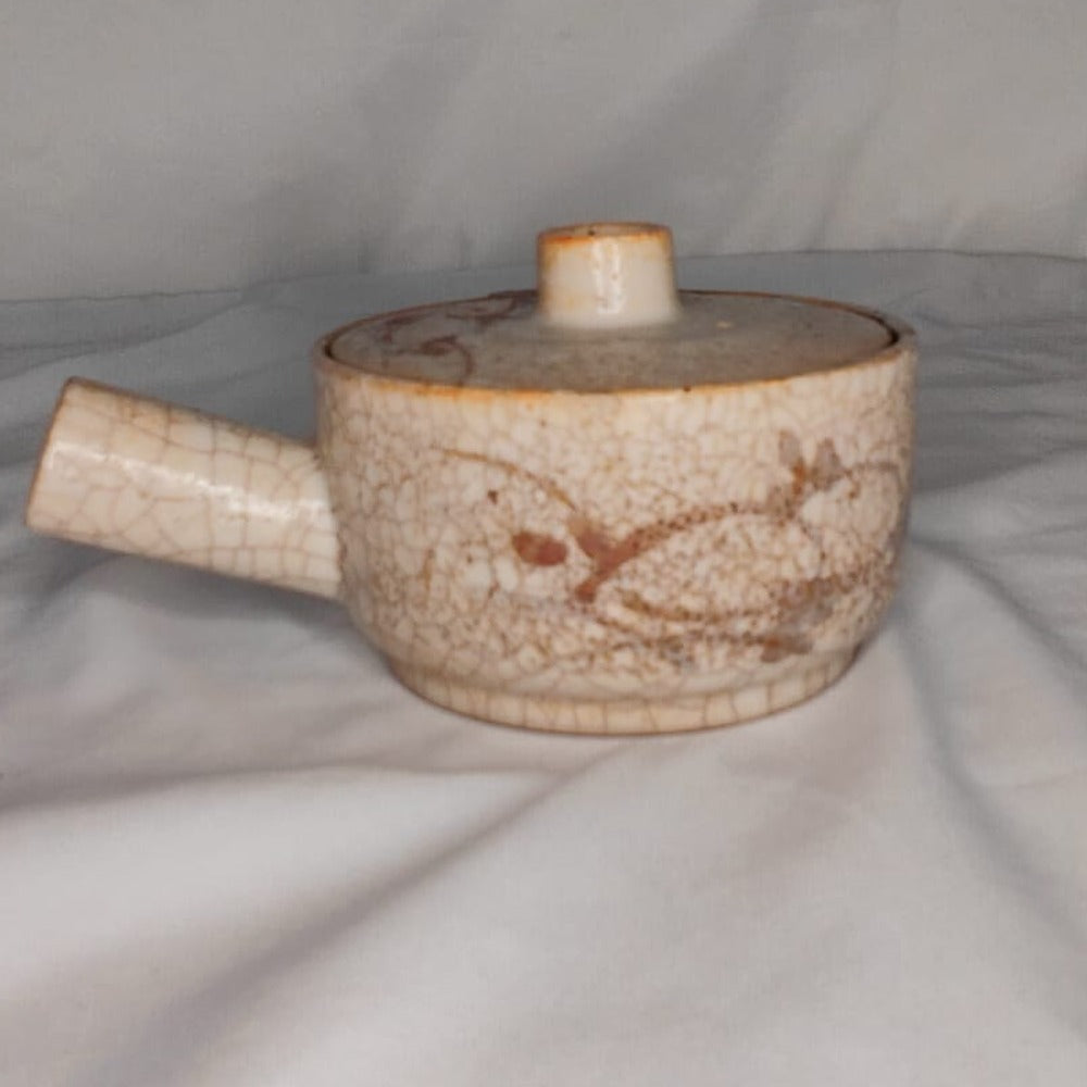 Ensemble beige avec craquelures décoratives et motifs végétaux marrons.