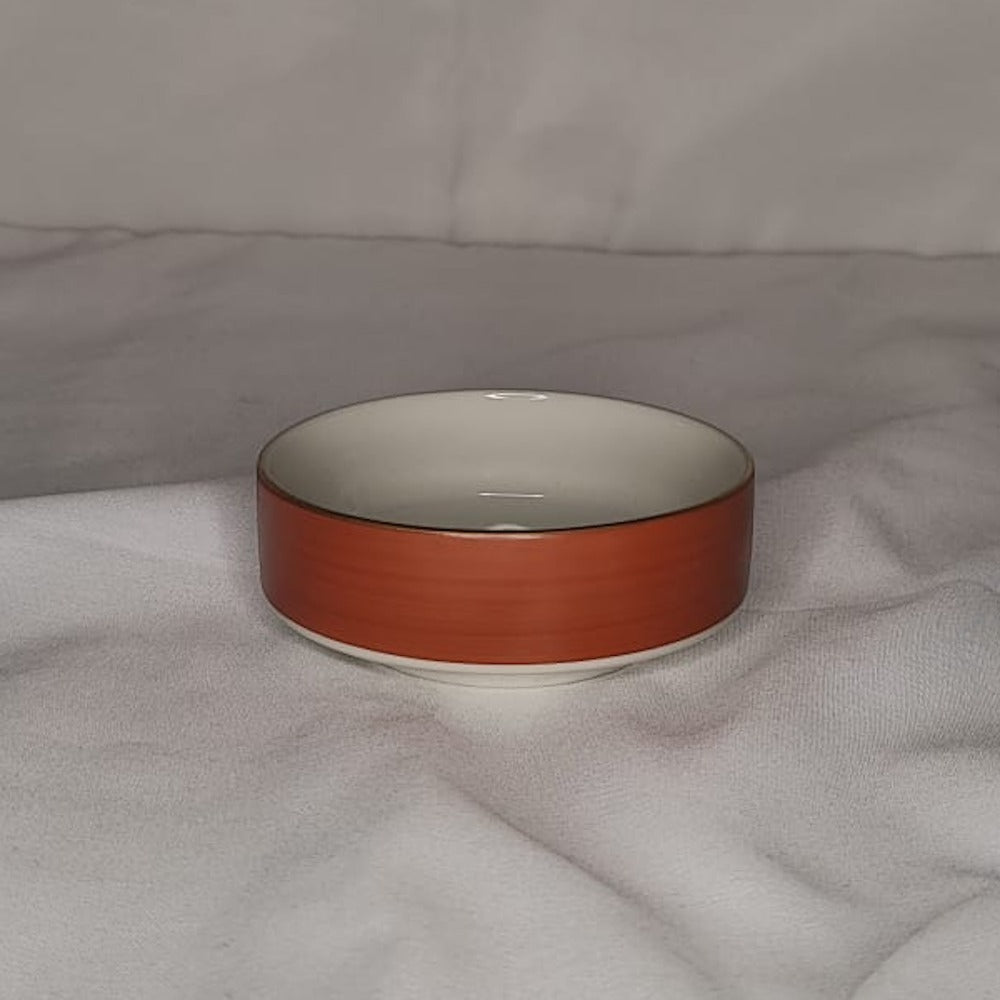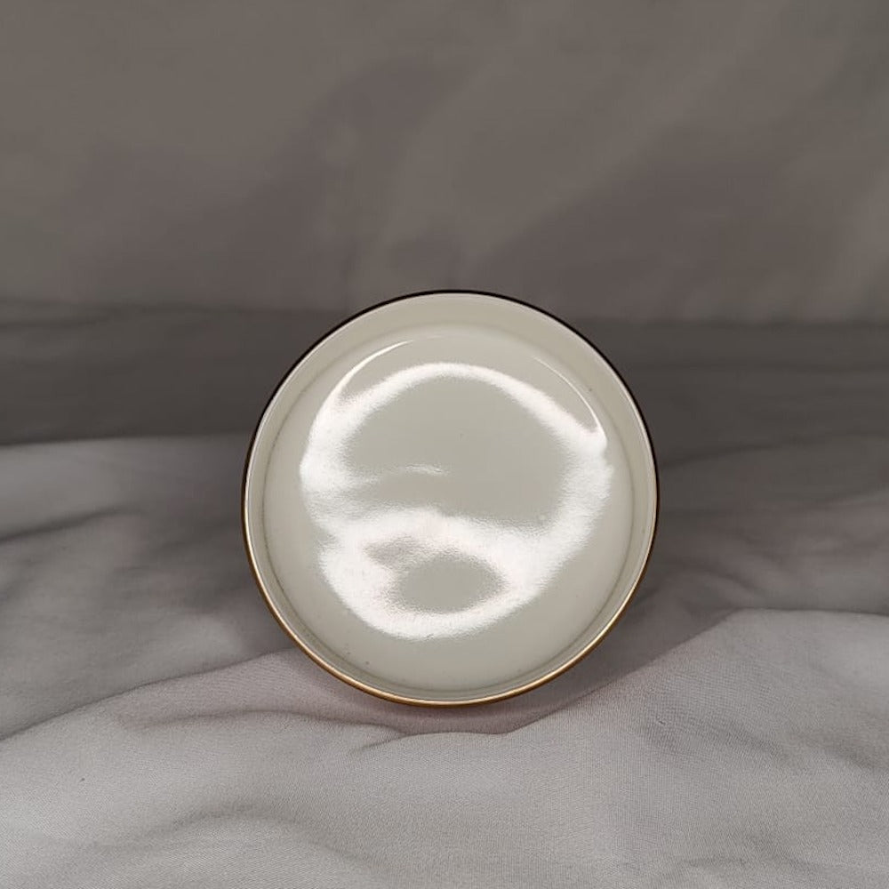 Ensemble de vaisselle orangé mat, doré et blanc brillant.